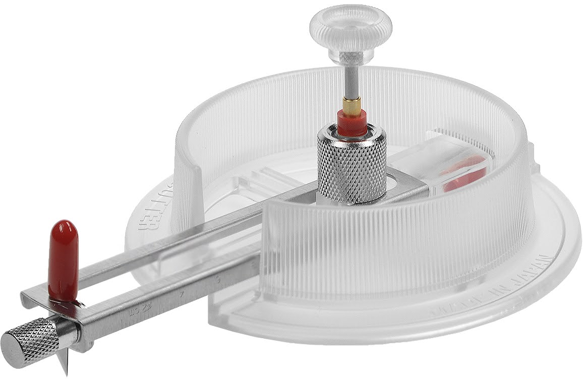 De transparante cirkelsnijder snijdt cirkels vanaf 1.8 cm t/m 17 cm. Deze cirkelsnijder laat geen center-gat achter.
